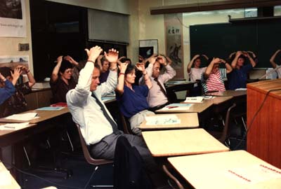 ▼鍾老師於天母美國學校指導天母外國社區人士練習氣功。(1995年)