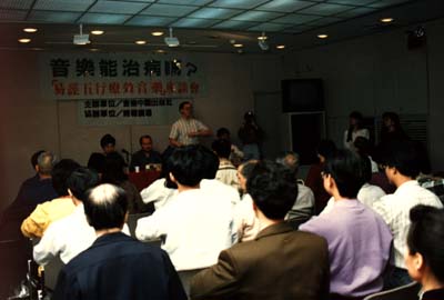 ▼鍾老師出席音樂中國出版社之「易經五行療效音樂」座談會作氣功調氣示範。(1993年)