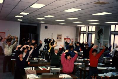 ▼鍾老師於桃園縣政府教授基層工會幹員養生功法。(1993年)